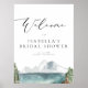 Esta señal de bienvenida para la despedida de soltera presenta una escena de lago en la montaña con árboles de pino y una fuente elegante en estilo acuarela. Cambie fácilmente la mayoría de las palabras para que coincidan con las necesidades de su evento.