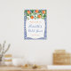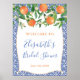 Naranjas de acuarela y hermosas flores sobre un fondo de patrón de baldosas azules cobalto y blancas para este elegante cartel de bienvenida de ducha de novia o de bebé.