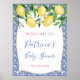 Limoneros acuarelados y hermosas flores sobre un fondo de patrón de baldosas azules y blancas para este elegante cartel de bienvenida a la ducha de boda o baby shower.