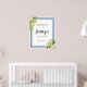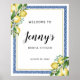 El letrero de bienvenida perfecto para una ducha de novia con tema de limón. Limones entrelazados en flores blancas y follaje verde están entrelazados con baldosas azules para crear un marco único.