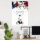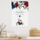 Poster de bienvenida acuarela con ducha de novia, con peonías color azul marino, blanco y marrón y rosas con tipografía elegante de escritura a mano.
