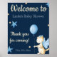 Decora tu fiesta de Baby Shower con este póster dando las gracias a tus invitados por venir. La ilustración es un dragón bebé con un globo azul y algunas estrellas y puntos amarillos en el fondo. Personaliza el texto con tu propia información. Ilustrado y diseñado por Patricia Alvarez. Productos coordinados disponibles en mi tienda.