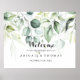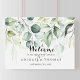 Este letrero de bienvenida a la fiesta de compromiso con eucalipto acuarela es perfecto para una celebración rústica. Este diseño artístico presenta follaje verde de eucalipto pintado a mano con acuarela, inspirando belleza natural.