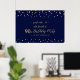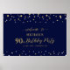 Bienvenidos a un día especial de celebración con este elegante cartel de bienvenida dorado y azul marino. Este poster presenta una tipografía moderna" Bienvenidos al cumpleaños 90 y un diseño de confeti hexagonal. Puede personalizar el nombre y la fecha. En mi tienda BaraBomDesign hay disponibles invitaciones y suministros para fiestas coincidentes.