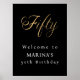 Un cartel de bienvenida para una fiesta de cumpleaños número 50. Fondo negro. Cincuenta escritos con un gran guión de estilo con letras a mano dorada. Personalice y agregue un nombre.