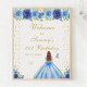 Este elegante y glamuroso cartel de bienvenida para la fiesta de cumpleaños incluye una hermosa princesa con el pelo rojo marrón y piel clara en un vestido de bolas azul. El texto combina el guión manuscrito y las fuentes sans serif modernas para un aspecto elegante y sofisticado. Los arreglos florales, las mariposas y los confeti dorados crean una perfecta mezcla de rústico y moda. Gráficos de www.etsy.com/uk/shop/SunflowerDayLove