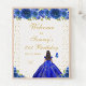 Este elegante y glamoroso cartel de bienvenida para la fiesta de cumpleaños muestra a una bella princesa con el pelo oscuro y la piel oscura en un vestido de bola azul real. El texto combina el guión manuscrito y las fuentes sans serif modernas para un aspecto elegante y sofisticado. Los arreglos florales, las mariposas y los confeti dorados crean una perfecta mezcla de rústico y moda. Gráficos de www.etsy.com/uk/shop/SunflowerDayLove