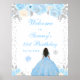 Este elegante y glamuroso cartel de bienvenida de la fiesta de cumpleaños de invierno presenta una hermosa princesa con el pelo oscuro y la piel oscura en un vestido de bola azul. El texto combina el guión manuscrito y las fuentes sans serif modernas para un aspecto elegante y sofisticado. Los arreglos florales, copos de nieve y confitis de plata crean la perfecta combinación de rústico y moda. Gráficos de www.etsy.com/uk/shop/SunflowerDayLove
