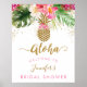 Toda futura novia merece un día especial para celebrar. Da la bienvenida a los invitados a la fiesta de despedida de soltera con un letrero personalizado adorable. Enmarque el letrero y muéstrelo en una mesa cerca de la entrada o monte el cartel en espuma y muéstrelo afuera en un caballete. El diseño presenta flores acuarelas tropicales veraniegas con confeti con brillo dorado falso y una piña con brillo dorado falso. El texto rosa y dorado coordinado complementa el hermoso diseño floral.