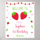 Bienvenido a sus fiestas invitados con un adorable cartel personalizado. Enmarcar el signo y mostrarlo en una mesa cerca de la entrada o montar el poster en espuma y mostrarlo al aire libre sobre un caballete. El diseño presenta fresas hechas a mano con adorables adornos de hojas y adornos florales.