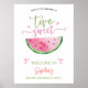 ¡Celebra a tu hijo de dos años con el tema de la sandía! Ideal para fiestas de 2º cumpleaños para su bebé de verano. Este divertido cartel de cumpleaños con temática de melón presenta una sandía acuática y el guión "One in a melon". Personalice su información o haga clic en "Haga clic en el personalizar más adelante" para editar estilos de fuente, tamaño y colores.