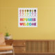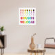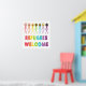 El diseño Refugees Welcome presenta una colección diversa de personas con palos en un grupo acogedor. La redacción y los colores celebran la diversidad, los recién llegados y tienen por objeto garantizar que los refugiados y los migrantes se sientan bienvenidos.