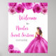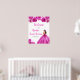 Este dulce cartel de bienvenida de dieciséis años cuenta con una bella princesa en un vestido de bola rosa caliente con arreglos florales. Es perfecto para una dulce fiesta de 16 años.