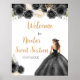 Este dulce cartel de bienvenida de dieciséis años cuenta con una bella princesa en un vestido de bata negra con arreglos florales. Es perfecto para una dulce fiesta de 16 años.