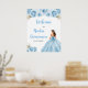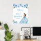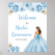 Este cartel de bienvenida de Quinceanera cuenta con una hermosa princesa adornada con un traje de bola azul con arreglos florales. Es perfecto para una fiesta de cumpleaños de Quinceanera.