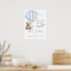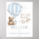 Este diseño de "aguardamos" presenta un osito de peluche color beige y marrón con una proa azul, sentado en una nube junto a un globo de aire caliente de estilo vintage toile de Jouy. Este diseño limpio y clásico es ideal para una ducha de bebé con un tema atemporal y neutro. La caligrafía estilizada está emparejada con las fuentes serif clásicas.