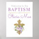 El es el poster perfecto para su bautismo, bautismo o comunión de niñas. Adornadas con una cruz purpurina de imitación dorada y simples rosas morados. Ideal para recibir a los clientes en el evento, ya sea enmarcado o colgado en una pared.
