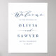 Bienvenido a su boda a los huéspedes de su boda con este signo de bienvenida de boda de personalizable. Presenta un guión delgado y una tipografía clásica en azul marino. Personalice este signo de bienvenida de boda azul marino agregando nombres, fecha, lugar u otros detalles. Este minimalista signo de bienvenida de boda de guiones es perfecto para cualquier temporada de boda o tema.