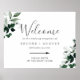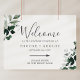 Este poster de bienvenida boda recto de esmeralda verde es perfecto para un boda boho. El diseño es elegante y rústico, con unas hojas de acuarela verde oscuro y un eucalipto con un toque bohemio moderno. Personalizar el poster con el nombre de la novia y el novio, y la fecha del boda.