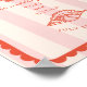 Ilustraciones de conchas rojas de arte lineal y borde de vieiras dibujado a mano con texto rojo sobre fondo rayado rosado.