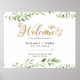 Este Poster de bienvenida Boda de color de agua verde dorado de orientación izquierda es ideal para una celebración inspirada en boho. El diseño combina la elegancia rústica con un ambiente moderno de bosque, con ricas hojas de color verde pálido y eucalipto.