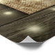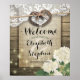 Plantillas de cartel de bienvenida de boda campestre de girasoles en herradura - Pareja antigua herradura corazón con lazo de cuerda y encaje blanco, flor de hortensia, luces de cuerda y tela de arpillera sobre fondo de madera de granero antiguo. Un diseño perfecto para tu gran día. ¡Todos los estilos de texto, colores y tamaños se pueden modificar para adaptarse a tus necesidades!