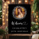 Un poster de bienvenida para una glamurosa fiesta de cumpleaños número 30 (o cualquier edad). Un fondo negro clásico decorado con un marco fotográfico falso purpurina plateado. Personalice y agregue una foto y un nombre. Bienvenidos con corazón.