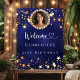 Un poster de bienvenida para una fiesta de cumpleaños glamurosa y femenina de 21 años (o de cualquier edad). Un fondo azul marino de colores desiguales decorado con falsas estrellas doradas que gotean. Personalice y agregue un nombre y una edad de 21 años. Bienvenidos con corazón. Añade tu foto dentro del marco falso del diamante.