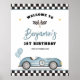 Celebra el día especial de tu pequeño velero con nuestro encantador cartel de bienvenida, diseñado exclusivamente para celebraciones de cumpleaños de niños. Este llamativo cartel combina el encanto vintage con el capricho lúdico, con un auto de carrera retro bellamente ilustrado, a una serena sombra de azul polvoriento, acentuado por los globos a juego.