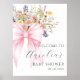 Póster de bienvenida para la fiesta de Baby In Bloom con lazo rosa