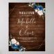 Poster de bienvenida boda floral azul marino azul oscuro, azul marino, hojas de eucalipto azul real, blanco, rosa ondulado y verde salado y elegante marco geométrico neutro purpurina sobre un fondo rústico de madera. Comuníquese conmigo para obtener ayuda sobre la personalización o si necesita cualquier otro producto con este diseño.