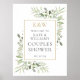Con delicada vegetación de acuarela, esta elegante señal de bienvenida para la ducha de la pareja se puede personalizar con las iniciales de tu monograma en oro y la información especial de la boda. Diseñado por Thisisnotme©