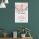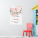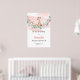 Diseño caprichoso para cartel de bienvenida para Baby Shower de niña que presenta jirafa bebé acuarela sentada sobre columpio de eucalipto con rosas rosadas marchitas. Letra de rotulación dibujada a mano moderna.