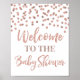 Bienvenido al cartel de la ducha de bebé con un patrón de confeti de oro rosa.