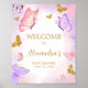 Póster Bienvenidos a Baby Shower con mariposa púrpura y d