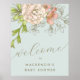 Vintage Blue Botanical Floral Baby Shower Poster de bienvenida con flores de melocotón y fuente caligráfica. Disponible como descarga digital.