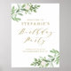 Bienvenido a tu evento con este cartel de bienvenida de la fiesta de cumpleaños del personalizable. Cuenta con una vegetación acuática y flores blancas con caligrafía caprichosa. Personalice agregando sus detalles. Este signo de bienvenida de cumpleaños verde es perfecto para los cumpleaños de primavera e invierno.