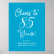 Elegante Aqua Blue Cheers to 85 Years 85th Birthday Welcome Poster Mostrar este elegante Poster de mensajes de bienvenida Aqua Blue en la entrada de la fiesta especial de cumpleaños. El texto es totalmente personalizable para que puedas personalizar el mensaje perfecto a tus invitados. Comprar nuestra tienda para más fiestas de planificación y suministros decorativos!