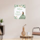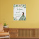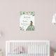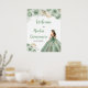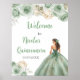 Este cartel de bienvenida de Quinceanera cuenta con una bella princesa en un vestido de bolas verde sabio con arreglos florales. Es perfecto para una fiesta de cumpleaños de Quinceanera.