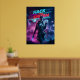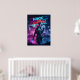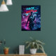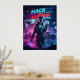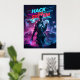 Tema: Mundo futurista, distópico, inspirado en los juegos del ciberpunk. Imagen central: personaje de estilo ciberpunk, con equipo de alta tecnología e interfaz holográfica. Antecedentes: Ciudad futurista con luces de neón, autos voladores y pantallas digitales. Texto: "Hack the System" y "Welcome to the Future". Colores: azul neón, morado, rojo y negro.