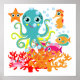 Nuestro diseño de Bienvenida al Océano es lindo, divertido y colorido, genial para los niños que aman el océano y todas las criaturas marinas que tiene para ofrecer. ¡Un pulpo azul, un caballo de mar, un pez, una estrella de mar y un cangrejo! Camisetas, tazas, bolsos, cartas, relojes de pared, bolsos, almohadas, revistas y más.