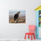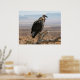 A large bird with impressive plumage sits perched on a twisted, dry branch, overlooking a vast and arid landscape with distant mountains. The bird's detailed feathers and the rugged terrain create a sense of wild, natural beauty.