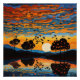 Reflected in the still water below, silhouetted birds holding a branch fly across an orange and blue sky as the sun sets behind a landscape with darkened trees; A.I. assisted print