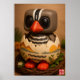 * A striped black and white pattern suggesting feathers is visible on its chest, peeking out from the egg.