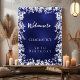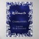 A welcome poster for a girly and glamorous 50th (or any age) birthday party. A navy blue background with a white frame of white snowflakes. The blue color is uneven. Personalize and add a name and age 21. White letters. Perfect for a winter party.