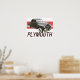 Imagen digitalmente mejorada de un golpe de Plymouth negro de 1941 sentado frente a dos bandas rojas horizontales y la palabra PLYMOUTH sobre fondo blanco.