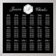 A black and white seating chart for a wedding reception with the bride and groom's names and monogram. This chart includes places for up to 18 tables, and can be customized for your reception.