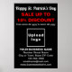 Poster negro para el Día de San Patricio que puede personalizar especificando el porcentaje de descuento, las fechas de venta, cargando el logotipo de su negocio, escribiendo su nombre de negocio, dirección, número de teléfono, correo electrónico y sitio web. Personalizar y muéstralo para atraer a más clientes a que compren sus productos o clientes para que les gusten sus servicios. Compruebe la apariencia después de cargar el logotipo y escribir textos. Si la apariencia le resulta agradable, puede realizar su pedido ahora. Si necesita cambiar el tamaño y la posición del logotipo y los textos para que encajen en este poster o en el tamaño y estilo que ha elegido, ajuste la herramienta de diseño. También puede cambiar el color de fondo, el color de fuente y el estilo de fuente en la herramienta de diseño. ¡Feliz Día de San Patricio! Le deseamos la mejor de las suertes, alegría y más ventas de esta fiesta.