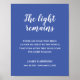 Esta elegante señal conmemorativa blanca sobre azul, con su conmovedora cita "La luz permanece" es una hermosa manera de recordar y honrar a sus seres queridos en la celebración de la reunión de la vida. Personalice con su texto en la parte inferior.