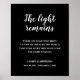 Esta elegante señal conmemorativa en blanco y negro, con su conmovedora cita "La luz permanece" es una hermosa manera de recordar y honrar a un ser querido en la celebración de la reunión de la vida. Personalice con su texto en la parte inferior.